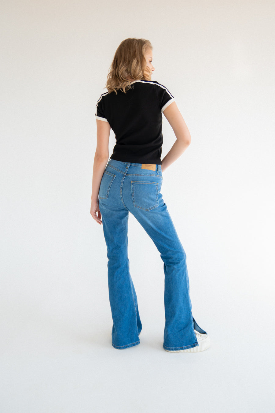 The top is a black. ribbed, short-sleeved t-shirt with white contrast binding on the collar and sleeves.