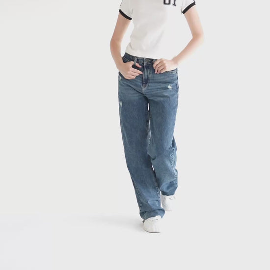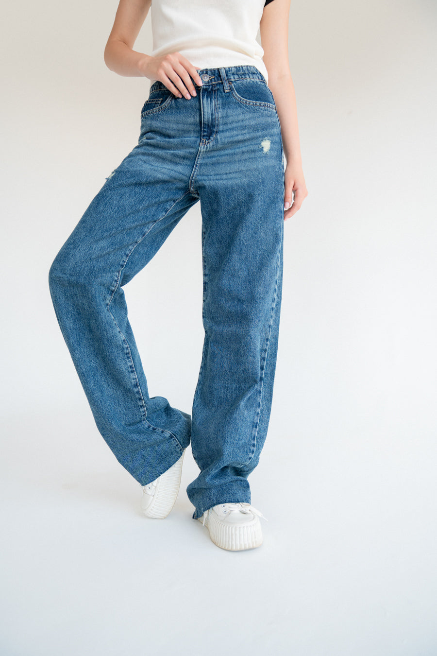 High-waisted full length dirty wash straight leg jeans with 5- pocket design, belt loop, zip fly & button.