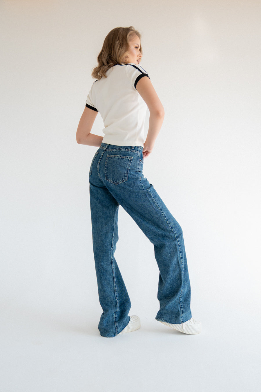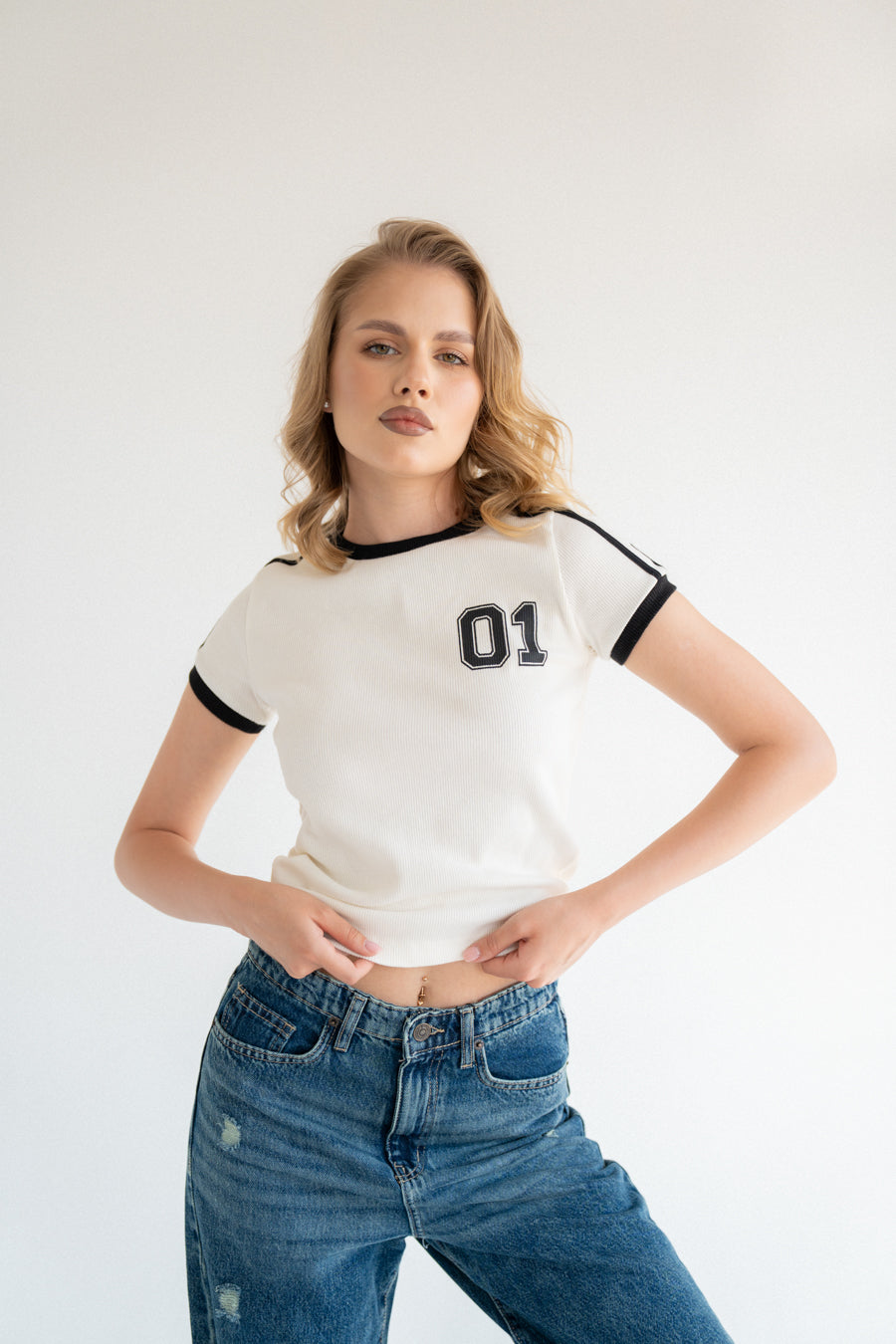The top is a white. ribbed, short-sleeved t-shirt with black contrast binding on the collar and sleeves.